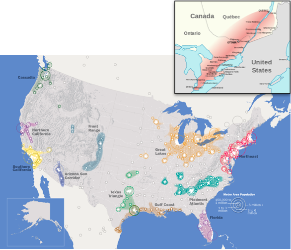 In their paper, the VT Metropolitan Institute describes ten current U.S. Megapolitan Areas. Below is a map of a slightly different, but largely overlapping interpretation of the currentU.S. Megalopoli, as well as a map of the Quebec City-Windsor Corridor, a densely populated and industrialized region of Canada adjacent to the Lakes in the north.