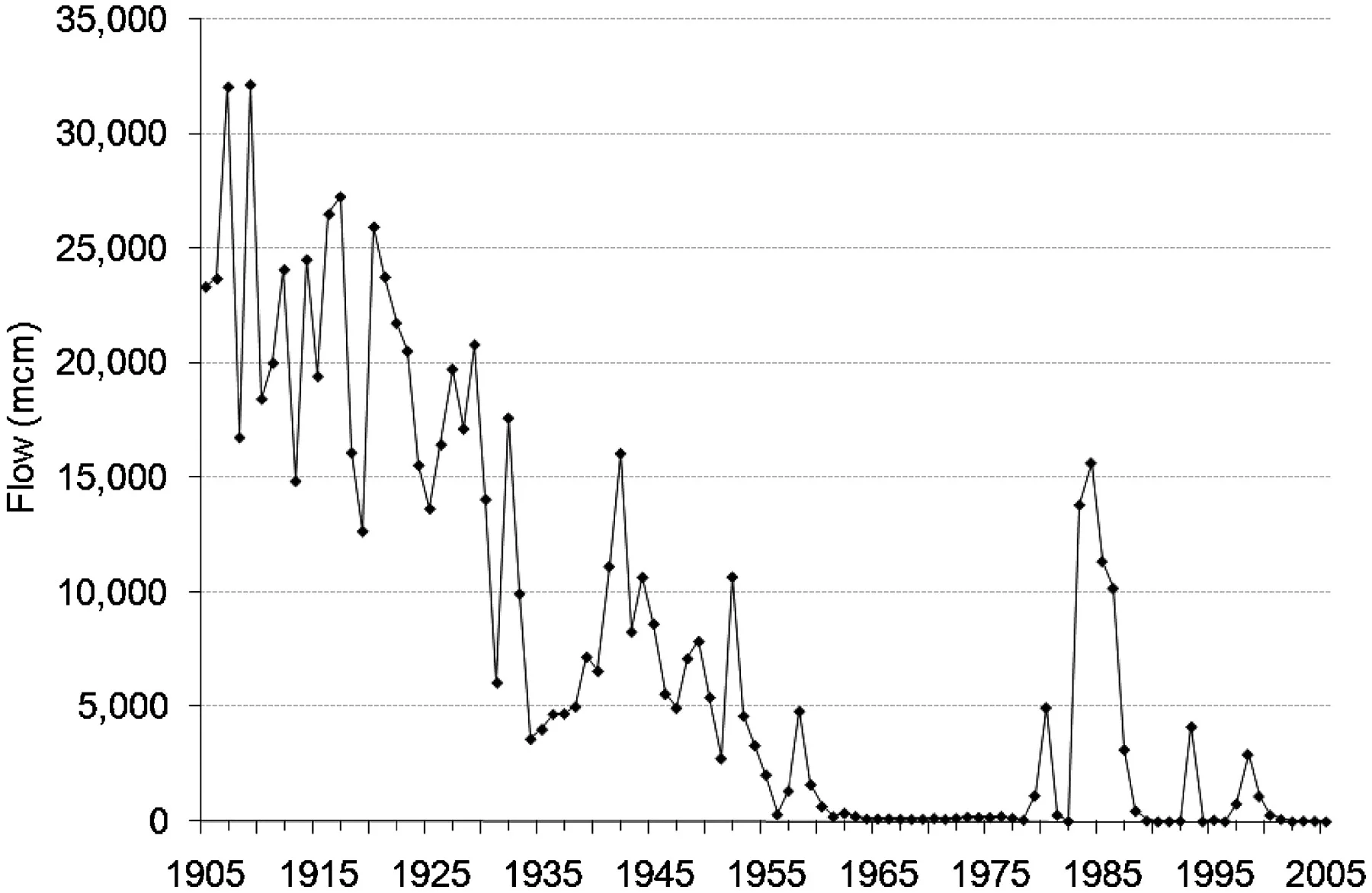 “Annual flows (in millions of cubic meters) of the Colorado River into the delta from 1905 to 2005 at the Southern International Border station. Note that, in most years after 1960, flows to the delta fell to zero as total withdrawals equaled total (or peak) renewable supply. The exceptions are extremely high-flow years when runoff exceeded demands and the ability to store additional water.” (1)